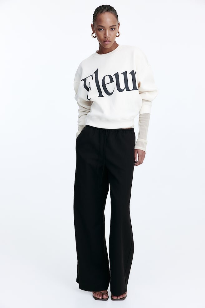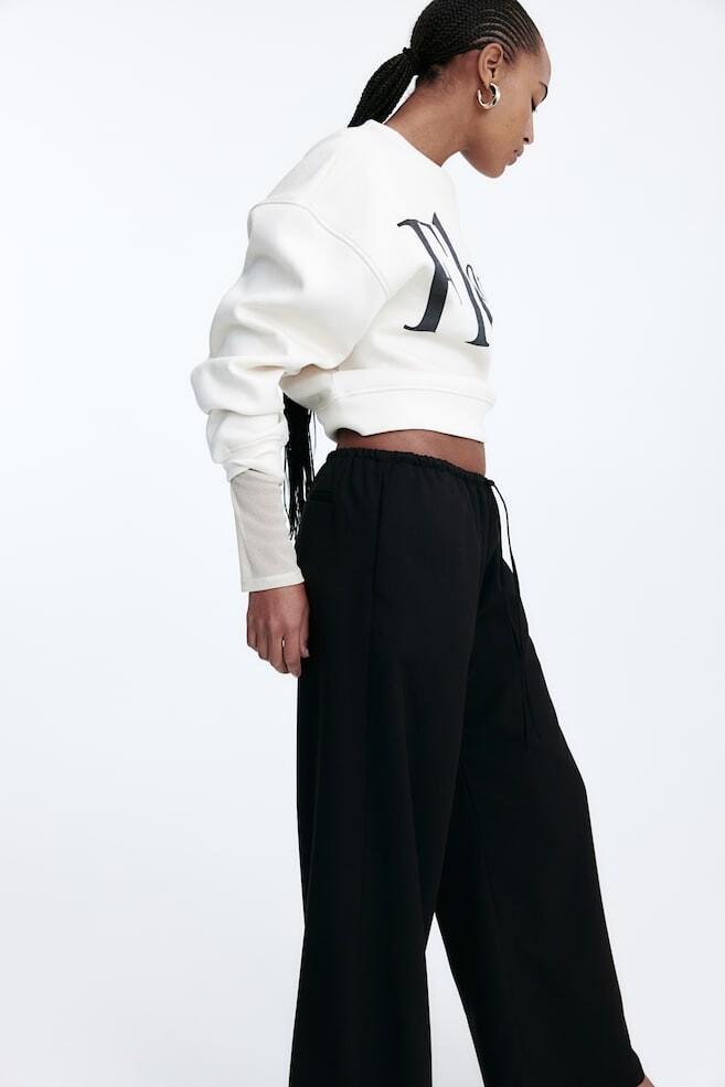 Брюки из твила с эластичным поясом на шнурке и свободным кроем. Незаметные боковые карманы, ложные прорезные карманы сзади и прямые штанины.