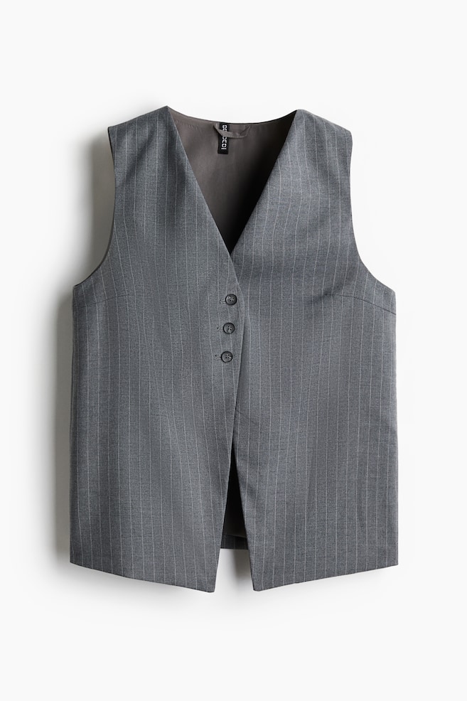 Длинный тканый жилет с V-образным вырезом и тремя ажурными пуговицами. На подкладке.