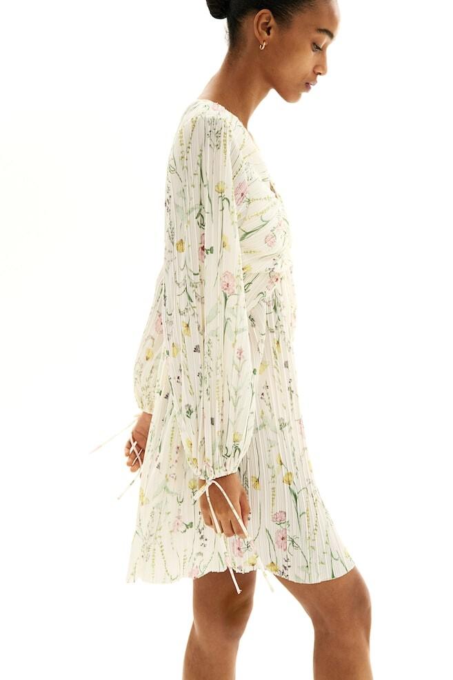 Короткое платье из плиссированного трикотажа с глубоким V-образным вырезом и диагональными швами под грудью. Длинные рукава-фонарики с резинкой и завязками. Юбка А-силуэта с необработанным подолом.