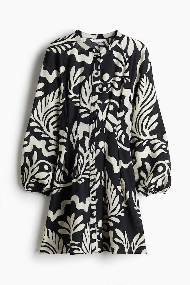 Короткое платье из ткани с воротником-стойкой и планкой с обтянутыми пуговицами. Длинные рукава-фонарики покроя реглан с узкими манжетами на пуговицах. Складки на талии создают изящный силуэт. Без подкладки.