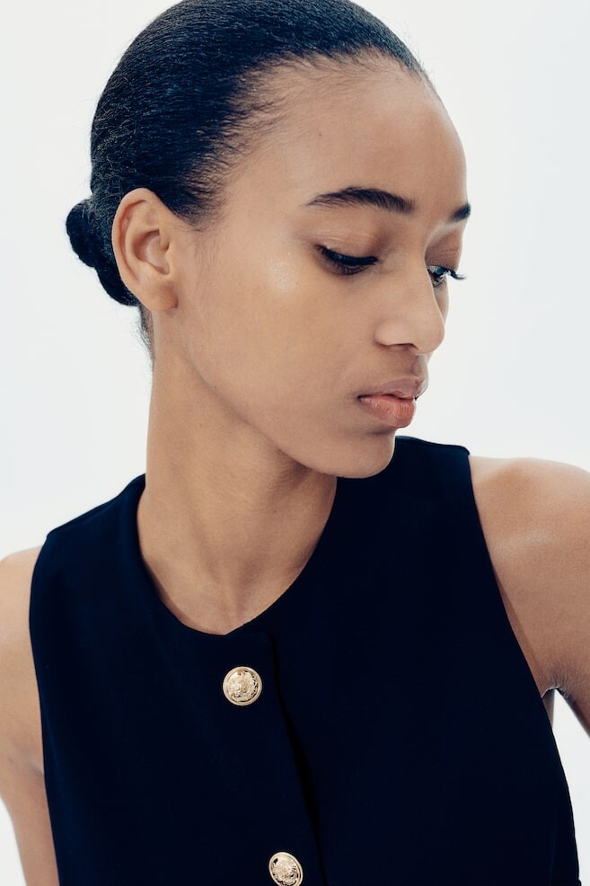 Короткий жилет из трикотажа «букле». С круглым вырезом, вытачками на груди и застежкой на кнопки с рисунком. Свободный крой. На подкладке.