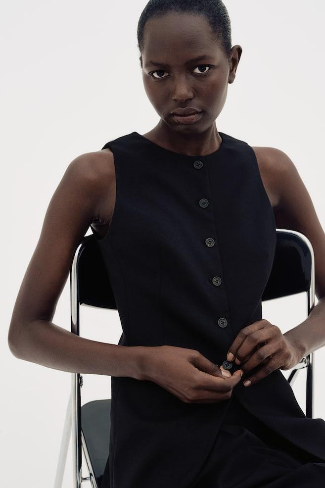 Длинный, приталенный жилет из тканого материала с круглым вырезом и пуговицами спереди. Формирующие вытачки на талии, прорезные карманы и разрез сзади. На подкладке.