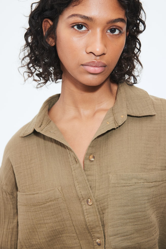 Блузка из мягкого хлопка с воротником, застежкой на пуговицы и кокеткой со складкой сзади. Свободный крой. Спущенные плечи, манжеты на пуговицах и открытые нагрудные карманы. Слегка закругленный подол.