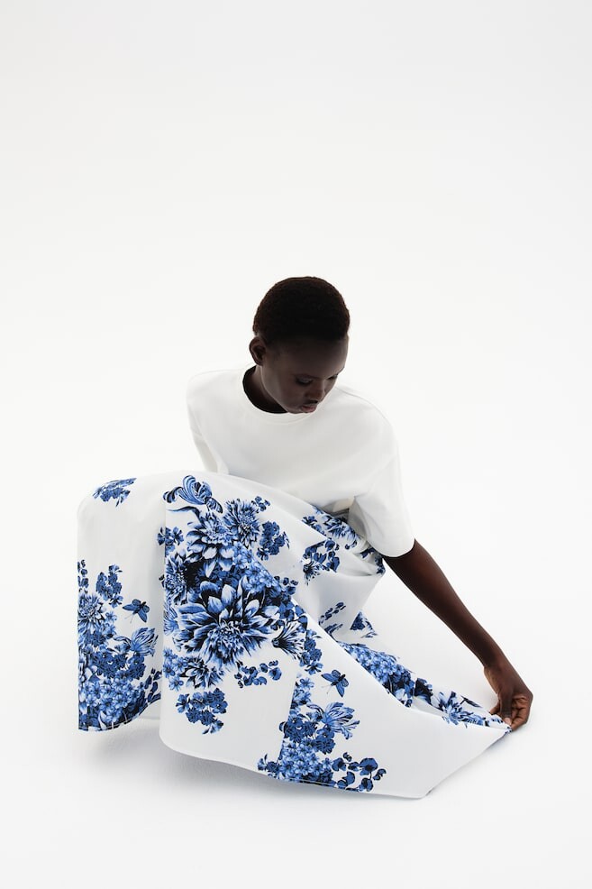 Юбка свободного кроя длиной до икр из фактурного хлопкового поплина. Высокая талия с широкими завязками с одной стороны и потайной молнией с другой. Без подкладки.