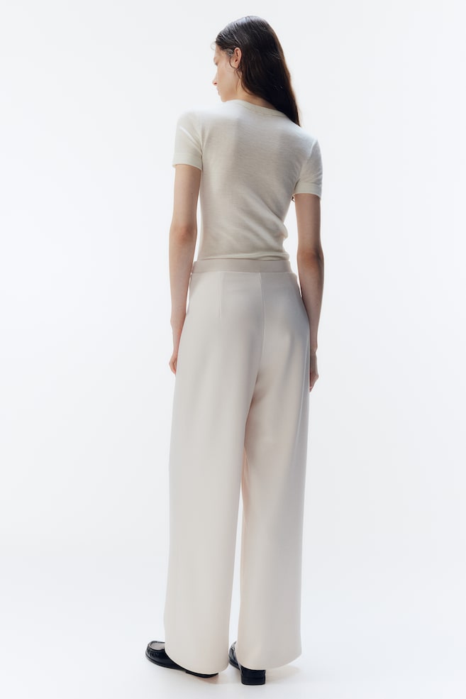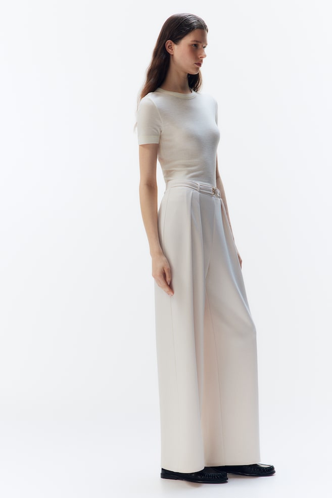 Элегантные плиссированные брюки из крепового трикотажа с высоким эластичным поясом, декоративным поясом с металлическим трензелем и прямыми широкими штанинами.