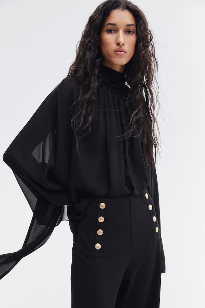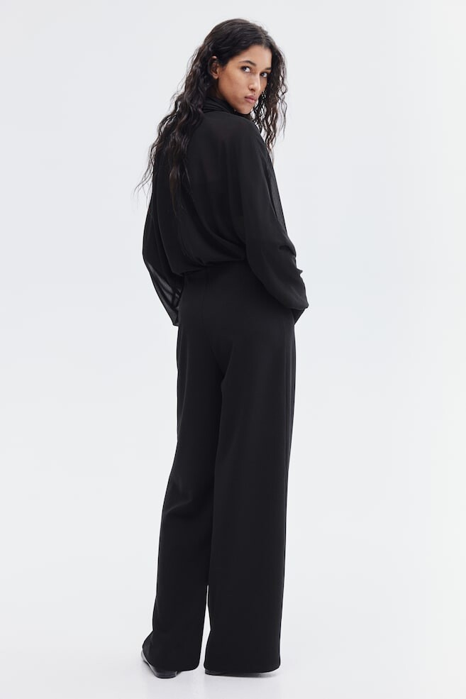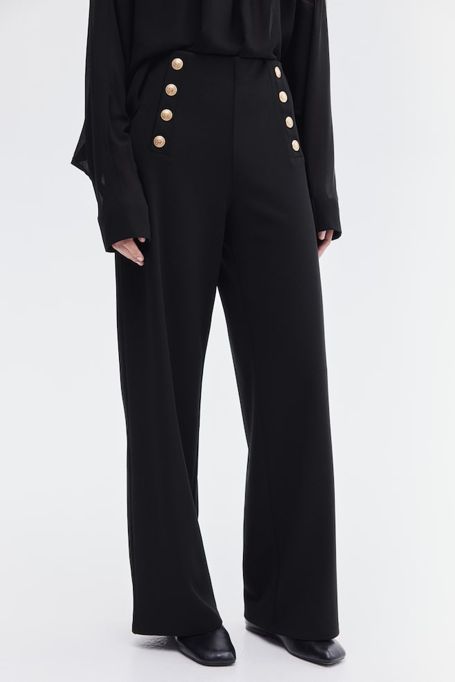 Брюки из плотного трикотажа. Высокий пояс со скрытой резинкой, декоративные пуговицы спереди и широкие прямые штанины.