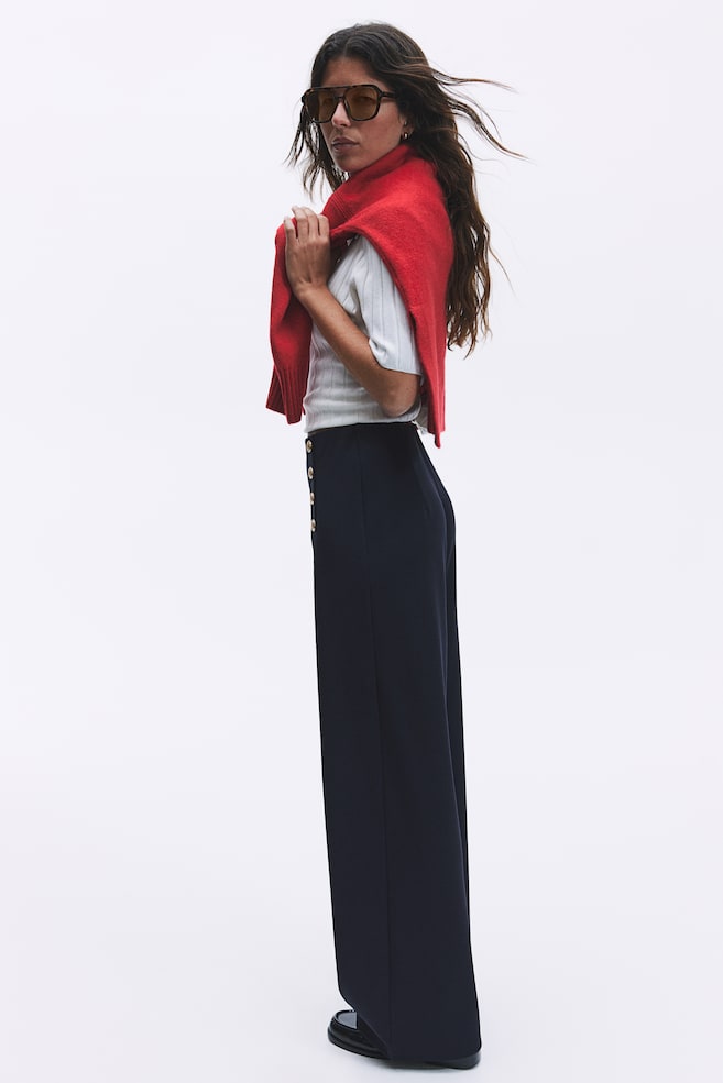 Брюки из плотного трикотажа. Высокая талия со скрытой резинкой, декоративные пуговицы спереди и широкие прямые штанины.