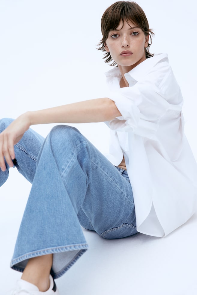 Джинсы с пятью карманами из стираного хлопкового денима. Модель прямого покроя, с широкими штанинами, высокой талией, застежкой-молнией и пуговицей спереди.