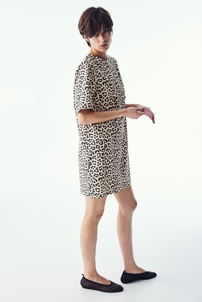 Короткое тканое платье с круглым вырезом и разрезом на горловине с потайной застежкой на пуговицу. Вытачки на груди, короткие рукава и прямой подол. Без подкладки.