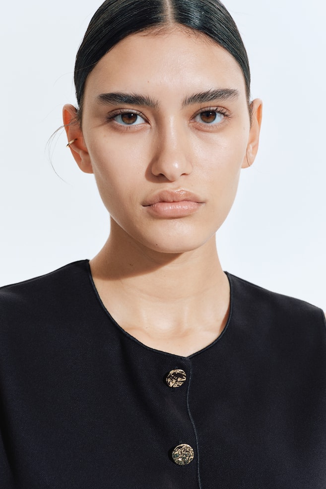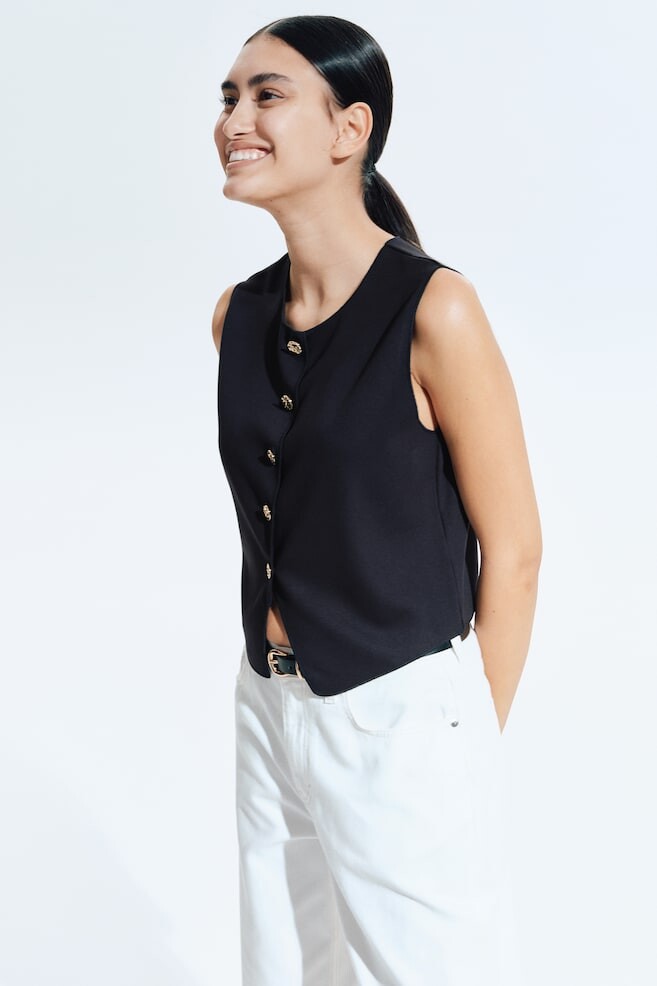 Короткий, приталенный жилет из плотного трикотажа с круглым вырезом и застежкой на пуговицы.