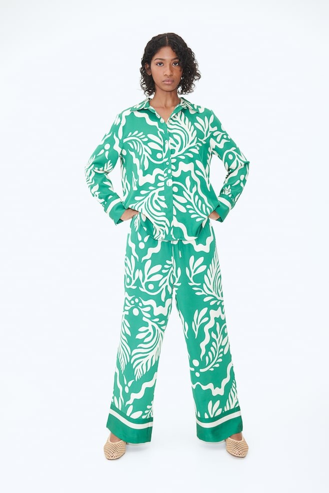 Длинная блузка-рубашка из мягкой узорчатой саржи с легким блеском. Модель с воротником, планкой на пуговицах и кокеткой сзади с плиссировкой. Слегка заниженная линия плеча и длинные рукава с широкими манжетами на пуговицах и пуговицей на разрезе рукава. Слегка закругленный подол.