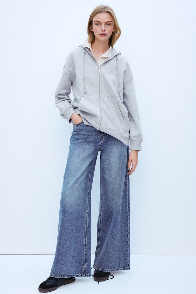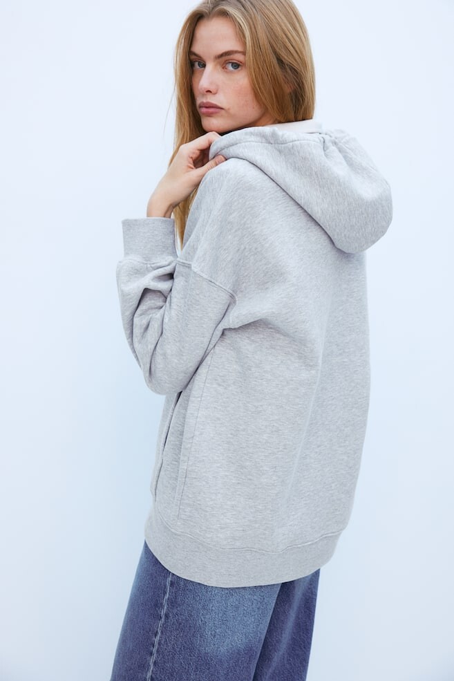 Куртка свободного кроя с капюшоном из трикотажной ткани с мягкой начесом внутри. Двухслойный капюшон, молния спереди, сильно спущенные плечи и карманы-кенгуру, а также ребристые манжеты и подол.