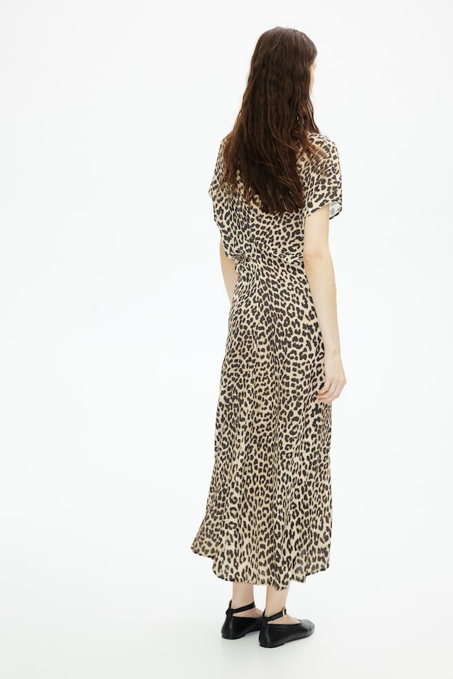 Платье длиной до икр, с круглым вырезом и потайной застежкой на молнию и крючок сзади. Короткие рукава, подчеркнутая талия и мягкая струящаяся юбка. Без подкладки.
