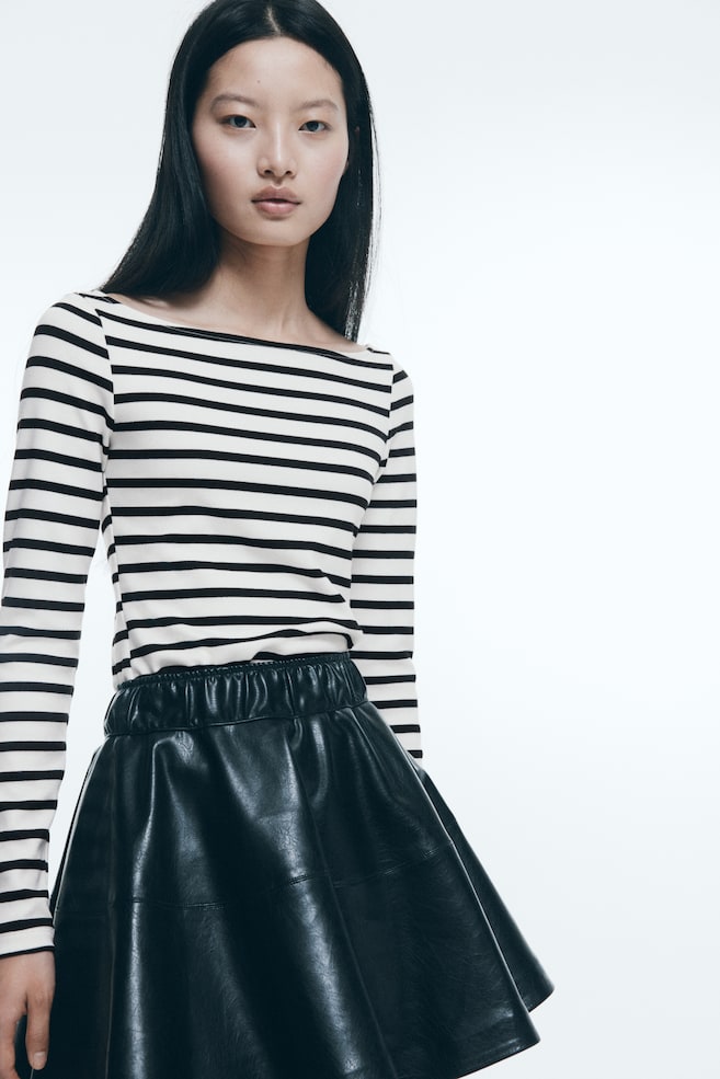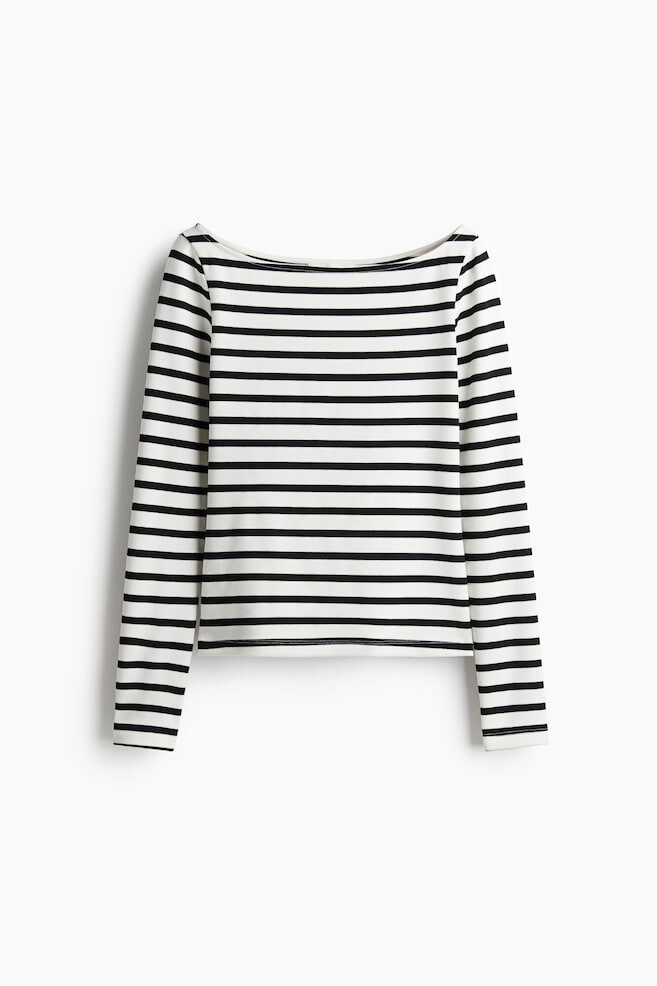 Облегающая трикотажная рубашка с вырезом-лодочкой и длинными рукавами.