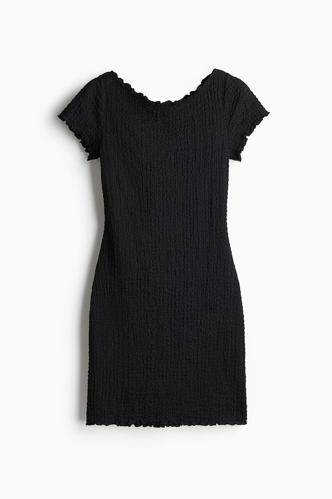 Короткое облегающее платье из жатого трикотажа с оверлочными краями. Вырез лодочкой и короткие рукава.