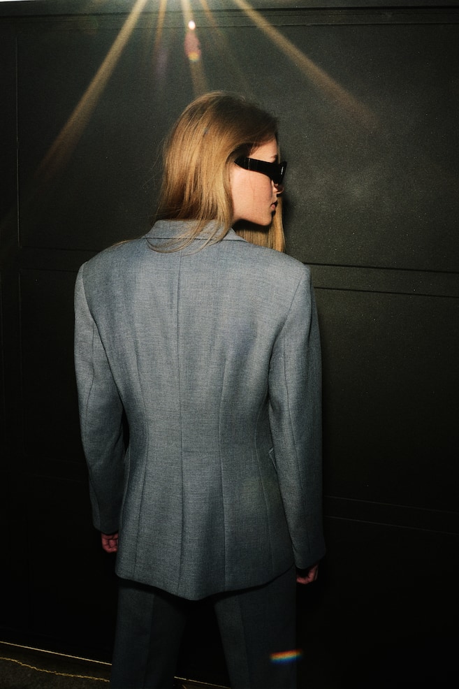 Двубортный тканевый пиджак с заостренными лацканами. Свободный крой. С подплечниками, прорезным карманом на груди и карманами с клапанами. Формирующие вытачки спереди и сзади создают приталенный фасон. На подкладке.