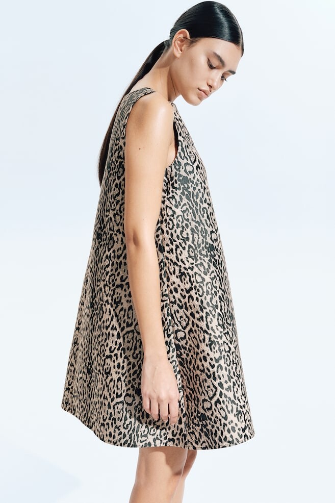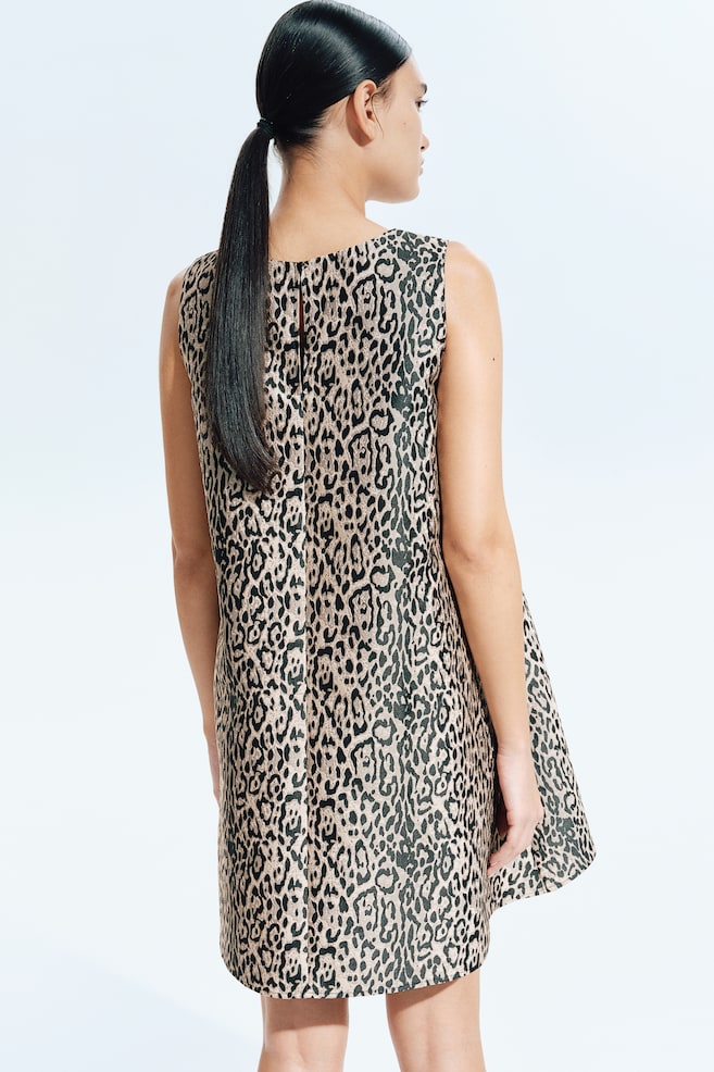 Короткое платье без рукавов из мерцающей жаккардовой ткани. Модель широкого А-силуэта с круглым вырезом горловины и вырезом-замочной скважиной с потайной пуговицей сзади. Подкладка сверху.
