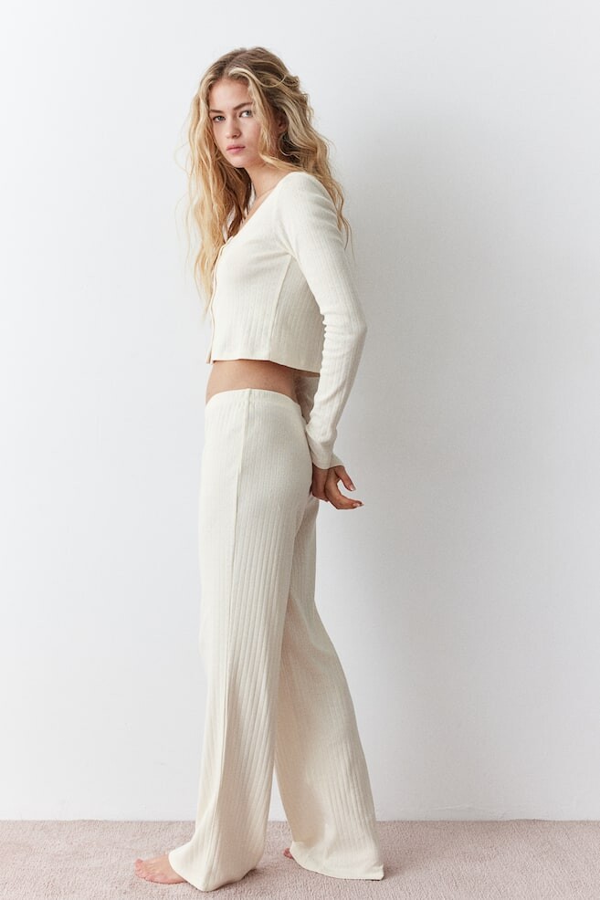 Пижама, состоящая из короткого кардигана и брюк, выполнена из ажурного хлопкового трикотажа. Кардиган с U-образным вырезом, застежкой на пуговицы и длинными рукавами. Прямые брюки с эластичным поясом и ложной ширинкой с видимыми пуговицами.