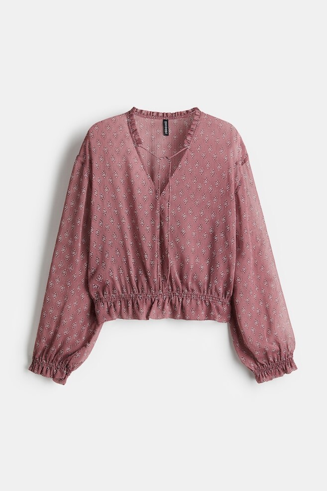 Блузка из тканого материала с воротником-оборкой, узкими завязками и V-образным вырезом спереди. Заниженная линия плеча и длинные рукава. Эластичная сборка и небольшая оборка на манжетах и подоле.