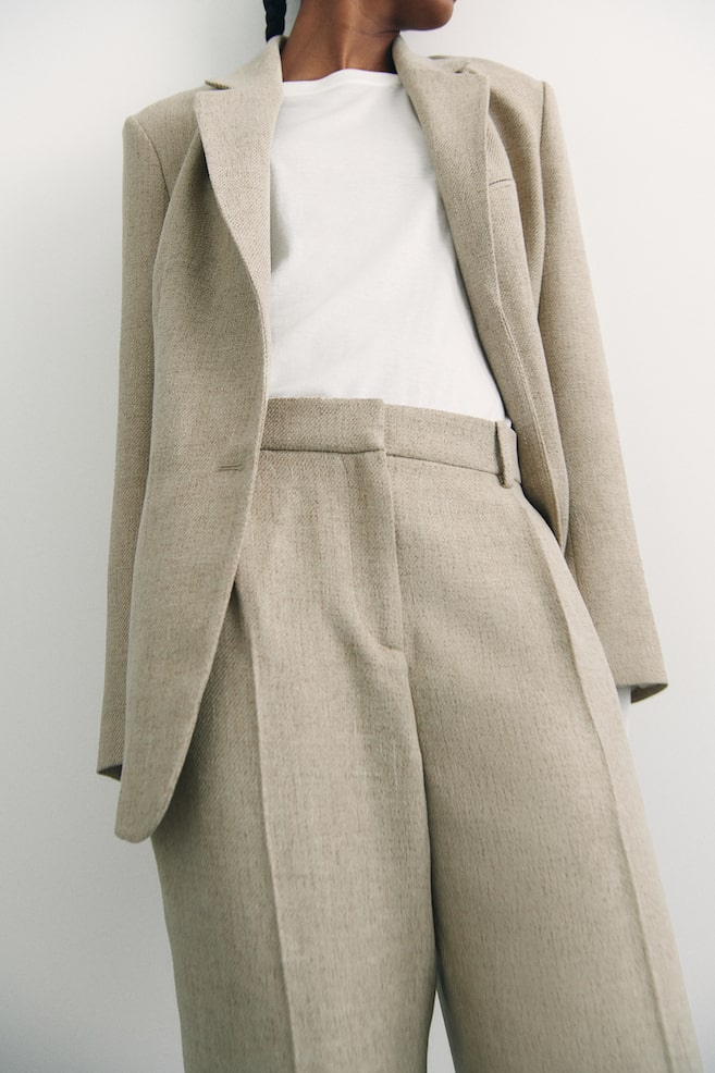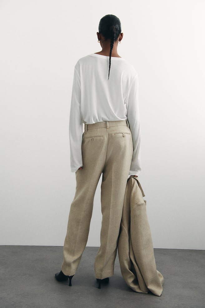 Элегантные тканевые брюки с высокой талией, застежкой-молнией и потайной застежкой на пуговицы и крючок. Незаметные боковые карманы, ложные задние карманы с пуговицей и слегка зауженные штанины со складками и стрелками спереди и сзади.