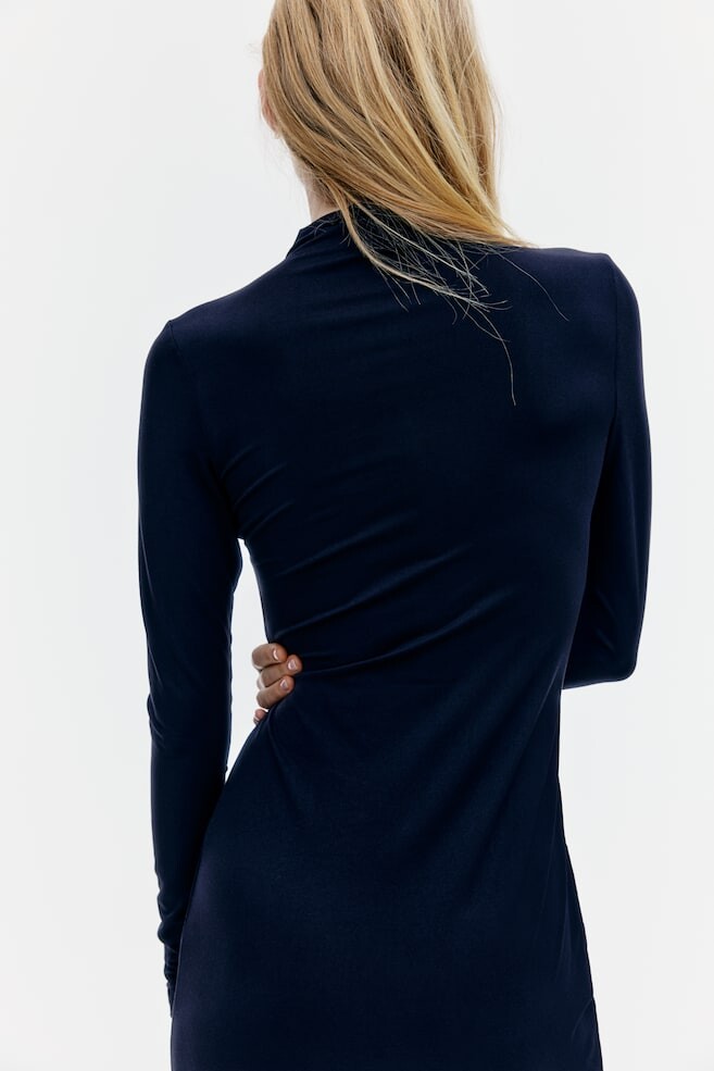 Длинное, облегающее платье из эластичного трикотажа с легким блеском. С водолазкой, длинными рукавами и прямым низом.