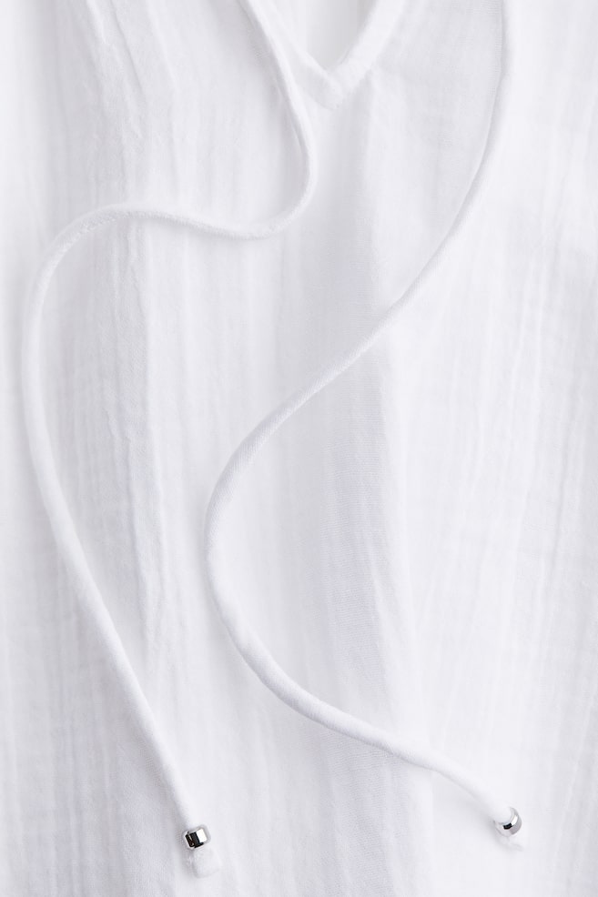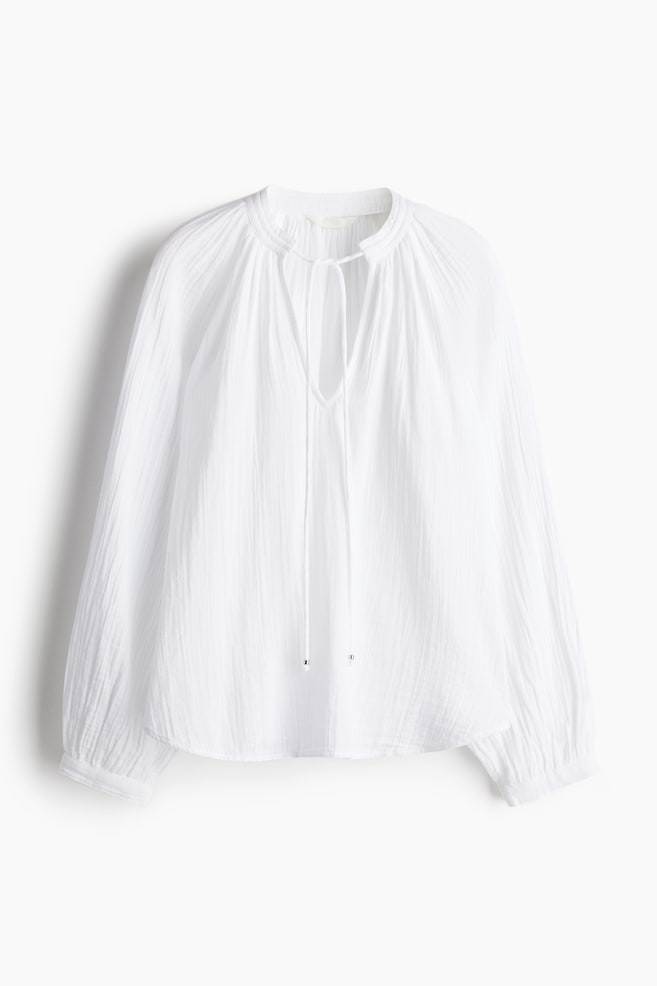 Блузка свободного кроя из мягкого хлопкового муслина. Воротник-стойка со стегаными швами и V-образным вырезом с узкими завязками. Длинные рукава-фонарики покроя реглан с узкими манжетами и закругленным подолом.