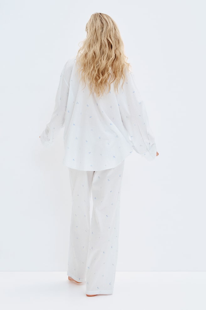 Пижама из мягкой хлопковой фланели. Длинный топ свободного кроя с воротником, планкой на пуговицах, спущенными плечами и манжетами на пуговицах. Брюки имеют эластичный пояс и прямые штанины.