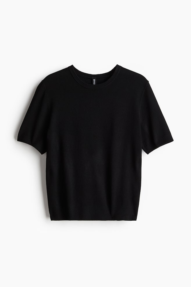 Короткая, приталенная футболка из мягкой, тонкой вязки с резинкой вокруг горловины, на манжетах и подоле.
