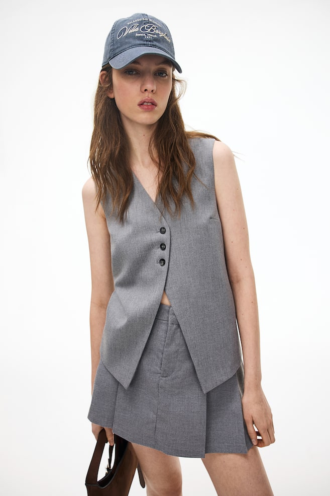 Длинный тканый жилет с V-образным вырезом и тремя ажурными пуговицами. На подкладке.