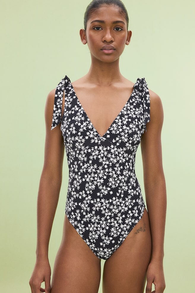 Купальник полностью на подкладке с V-образным вырезом и завязками на бретелях с фиксированными бантами сверху. Чашечки имеют съемные вкладыши, которые придают груди форму и хорошую поддержку. Высокий вырез по бедру и полузакрытая спина.