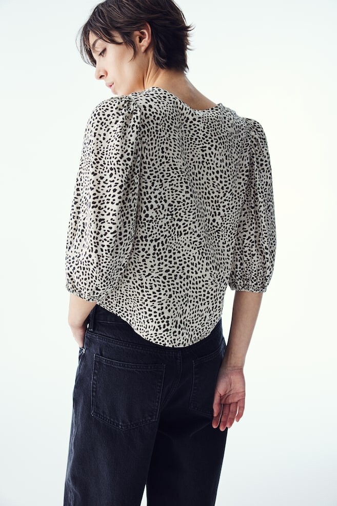Облегающая блузка из воздушной льняной ткани. Круглый вырез, застежка на пуговицы спереди и рукава-фонарики длиной 3/4 с эластичными манжетами.