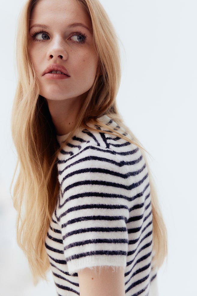 Облегающая футболка из мягкой тонкой вязки с ребристыми отделками по горловине, рукавам и подолу.
