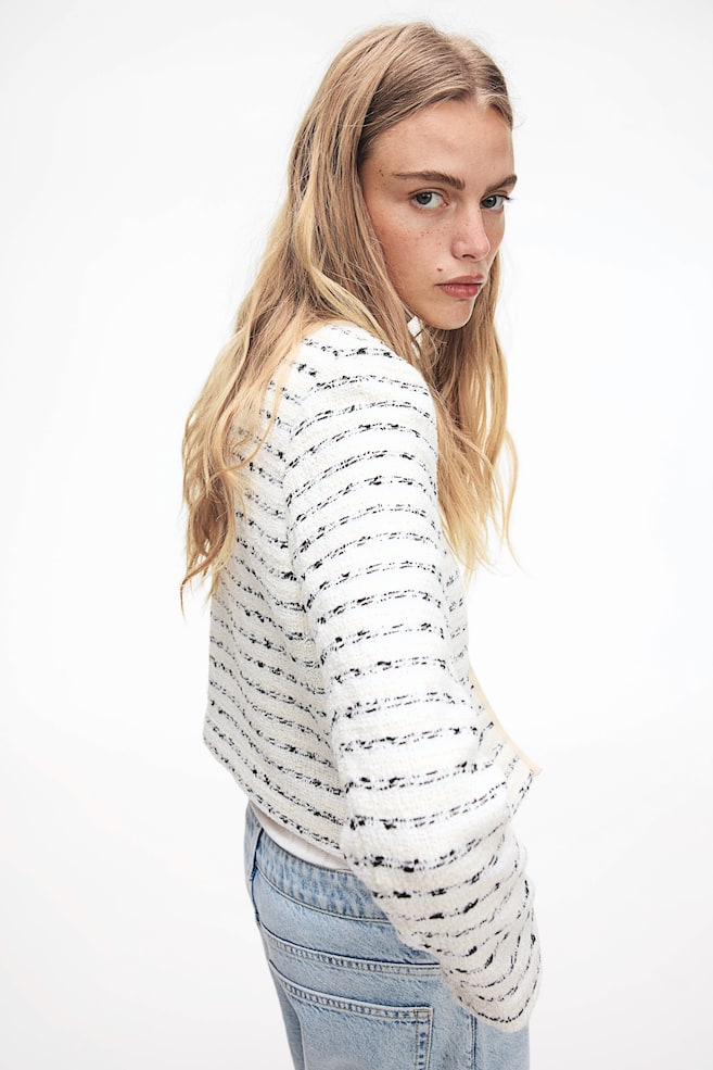 Короткая куртка из структурированной ткани с круглым вырезом, металлическими пуговицами спереди и декоративными прорезными карманами. На подкладке.
