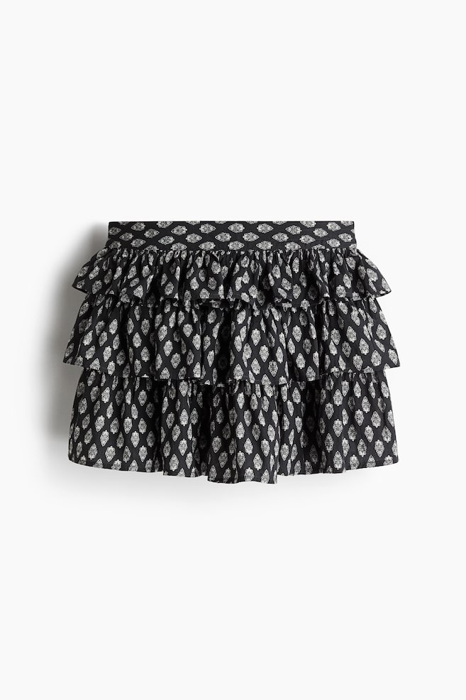 Короткая многоярусная юбка из узорчатого хлопка с обтянутой резинкой на поясе сзади. Под ним трикотажные шорты.