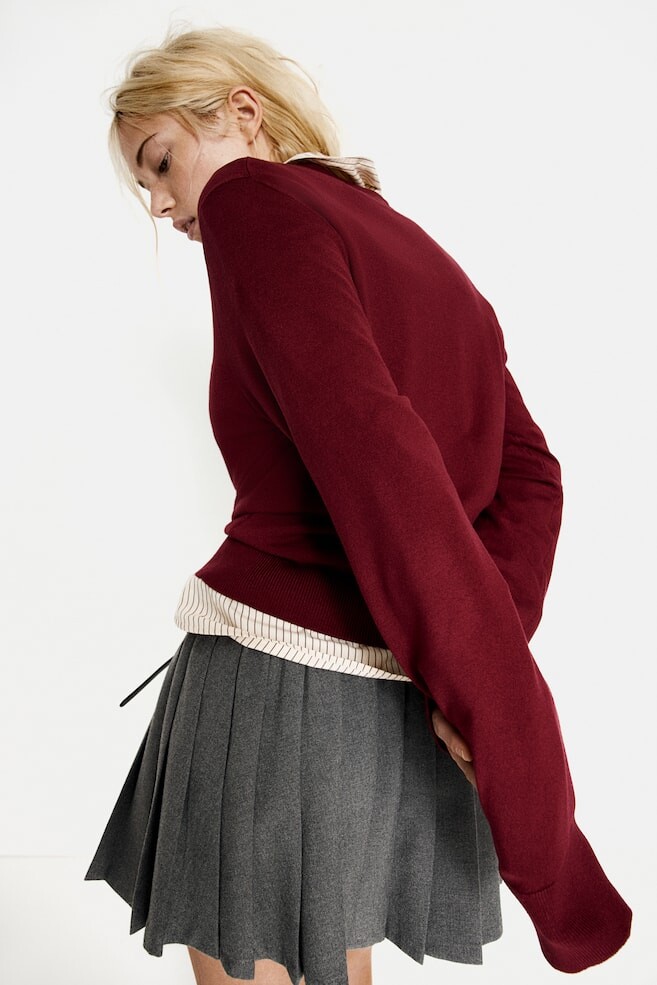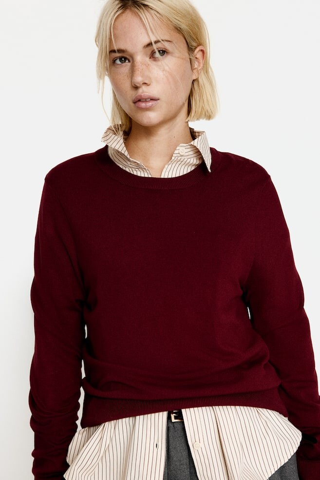 Тонкий трикотажный свитер из мягкой вискозной смеси с ребристым круглым вырезом и ребристыми манжетами на рукавах и подоле.