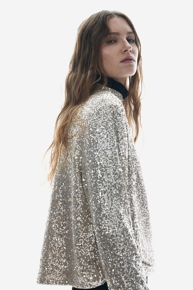 Рубашка с длинными рукавами из расшитой пайетками сетки, с водолазкой и потайной молнией сзади. Подкладка из джерси.