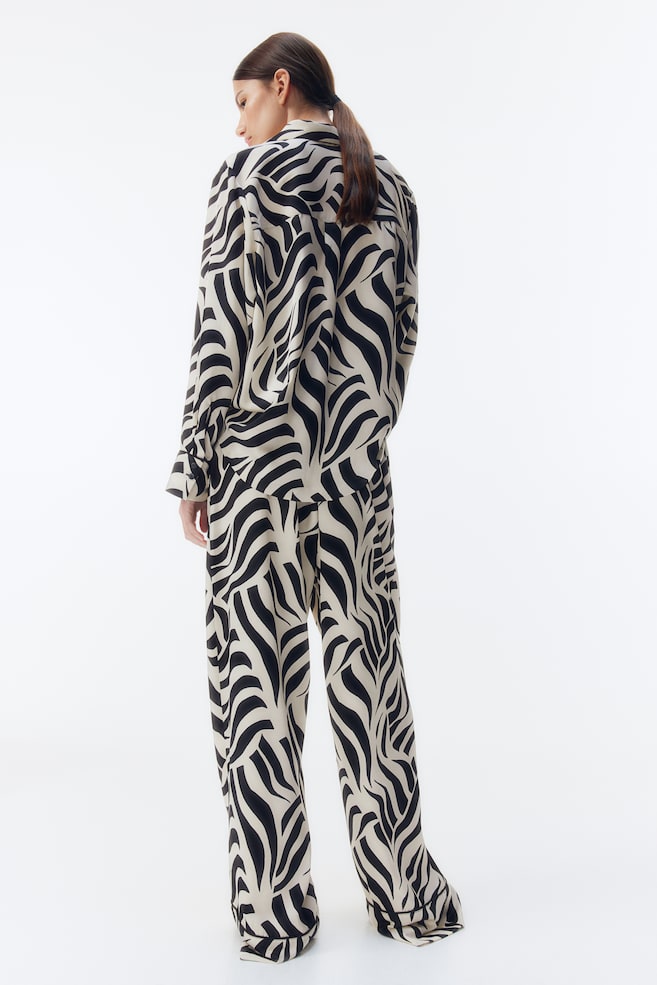 Брюки свободного кроя из саржевого полотна с легким блеском. Высокий эластичный пояс, незаметные боковые карманы и прямые штанины с кантом внизу.
