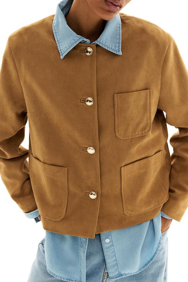 Куртка свободного покроя из начесаной ткани. Модель с круглым вырезом горловины, металлическими пуговицами спереди, накладными нагрудными и передними карманами. На подкладке.