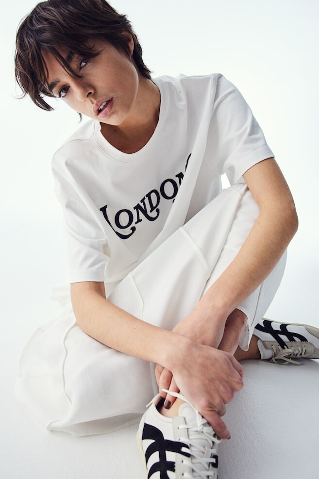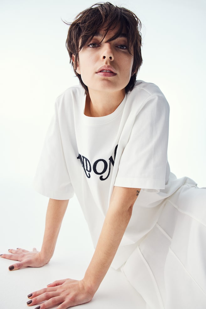Футболка оверсайз из хлопкового трикотажа с принтами и мелкими стеклянными бусинами. Круглый вырез, спущенные плечи и рукава до локтя.