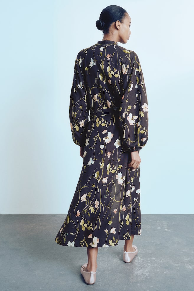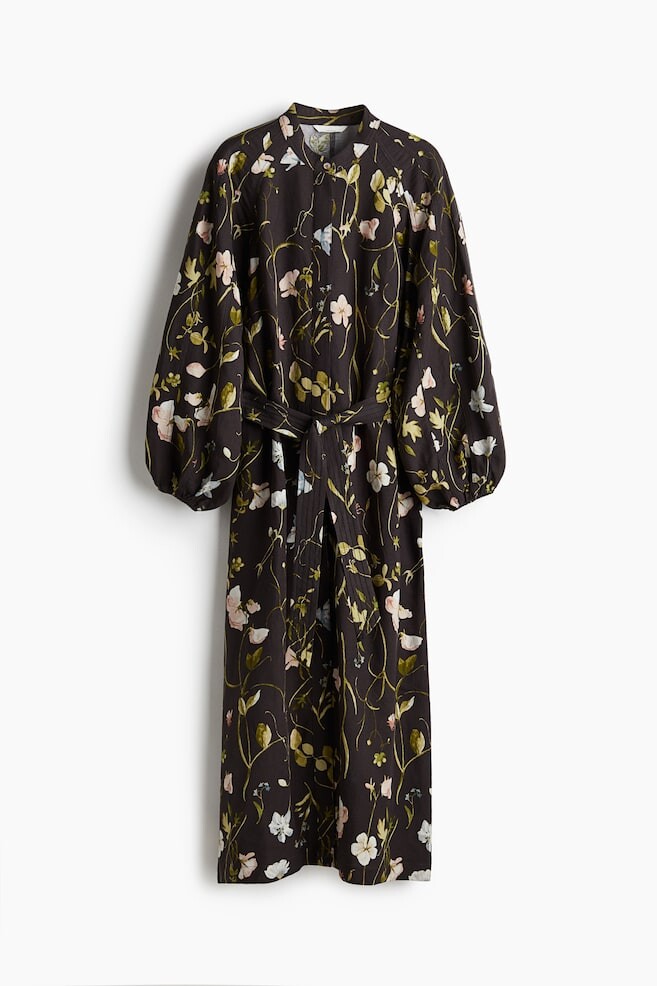 Платье длиной до икр из воздушной смеси льна и вискозы. С небольшим воротником-стойкой, потайной застежкой на пуговицы и широким съемным поясом. Длинные рукава-фонарики покроя реглан с узкими эластичными манжетами. Без подкладки.