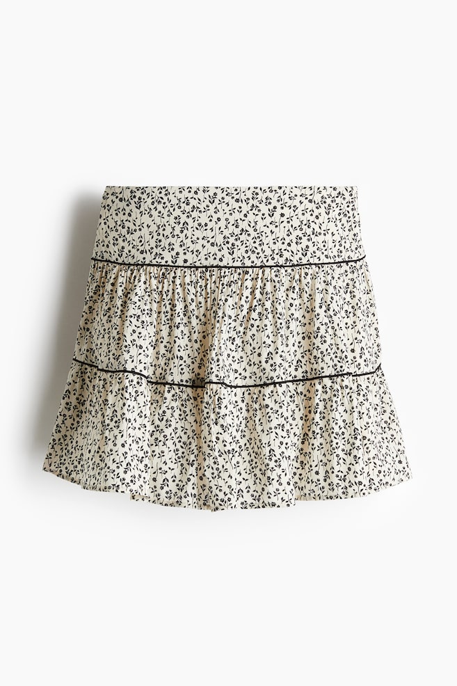 Короткая расклешенная юбка из воздушной хлопчатобумажной ткани с присборенными швами и изящной окантовкой. Высокий пояс со скрытой резинкой. На подкладке.