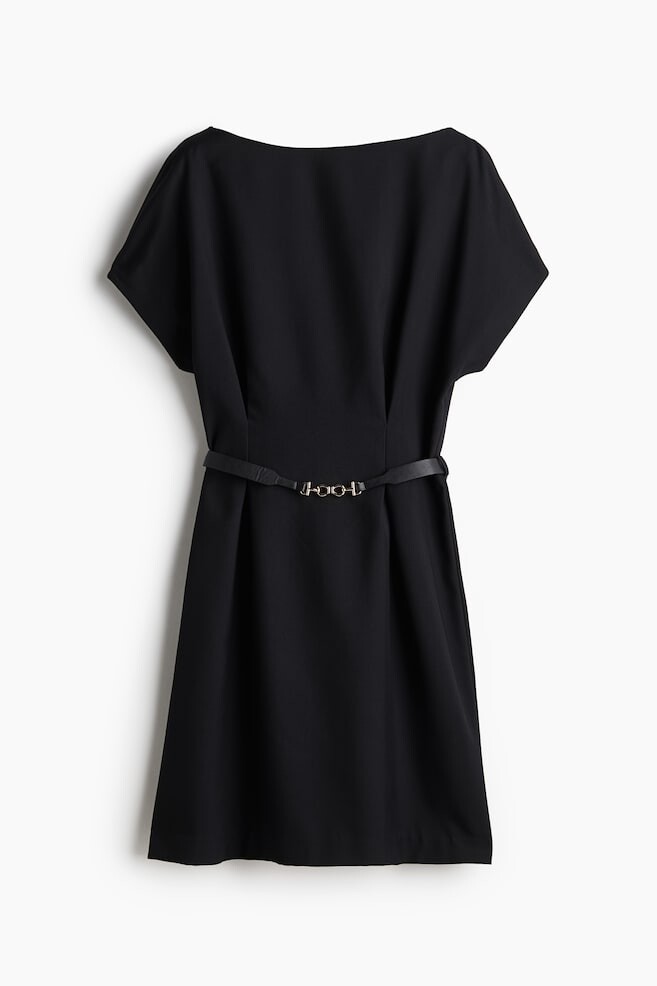 Платье из твила длиной до колена с вырезом-лодочкой и короткими рукавами. Подчеркнутая талия со складками спереди и сзади, съемный пояс с металлической пряжкой. Потайная молния сзади и прямой подол. Без подкладки.