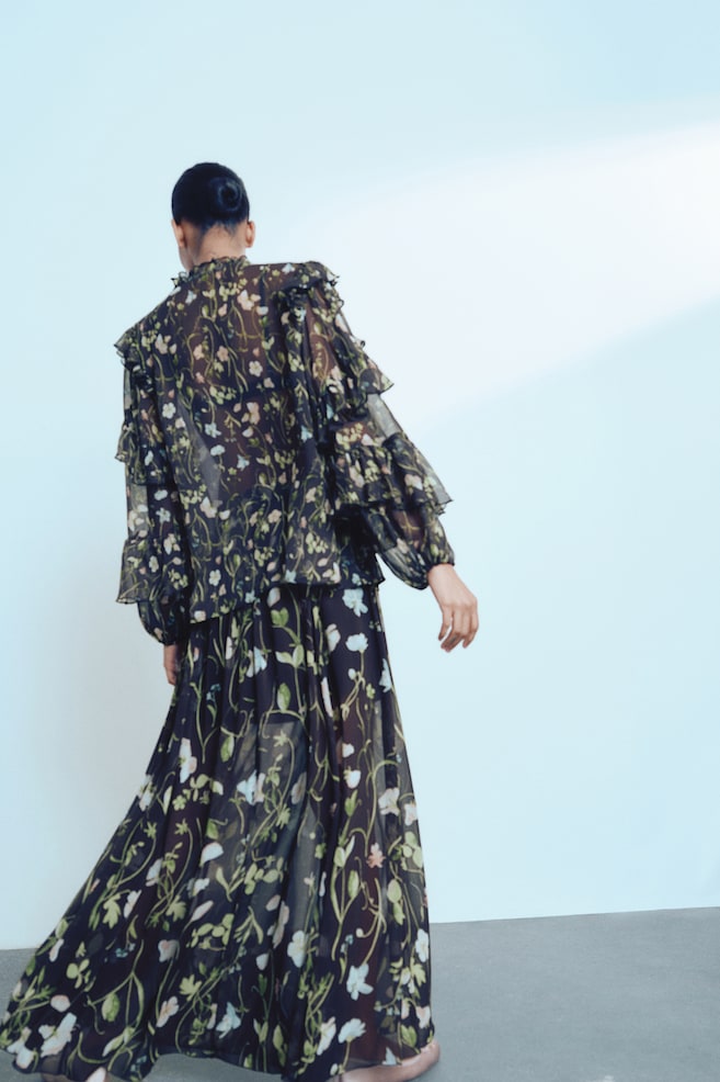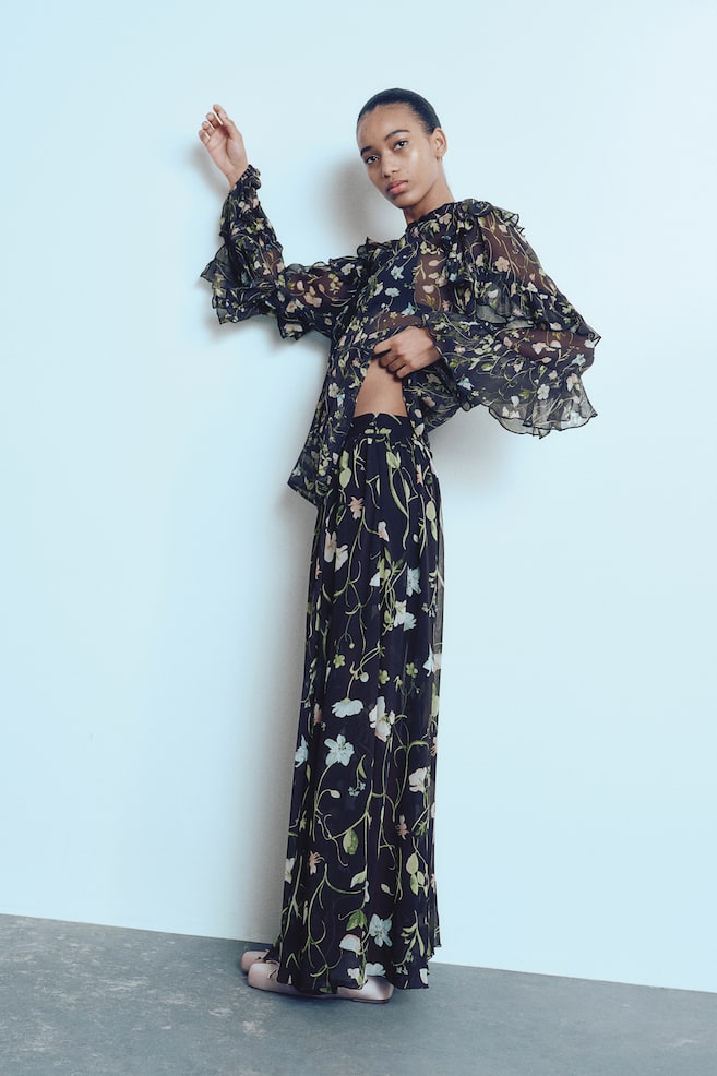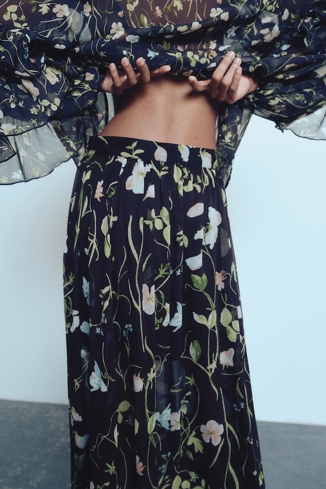 Юбка макси свободного кроя из жатого шифона. Высокая талия с потайной молнией и застежкой на крючок с одной стороны. Короткая трикотажная нижняя юбка.