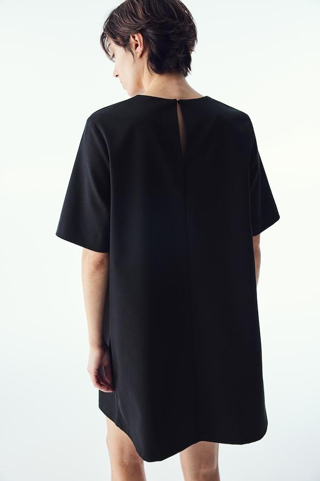 Короткое тканое платье с круглым вырезом и разрезом на горловине с потайной застежкой на пуговицу. Вытачки на груди, короткие рукава и прямой подол. Без подкладки.
