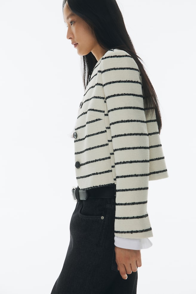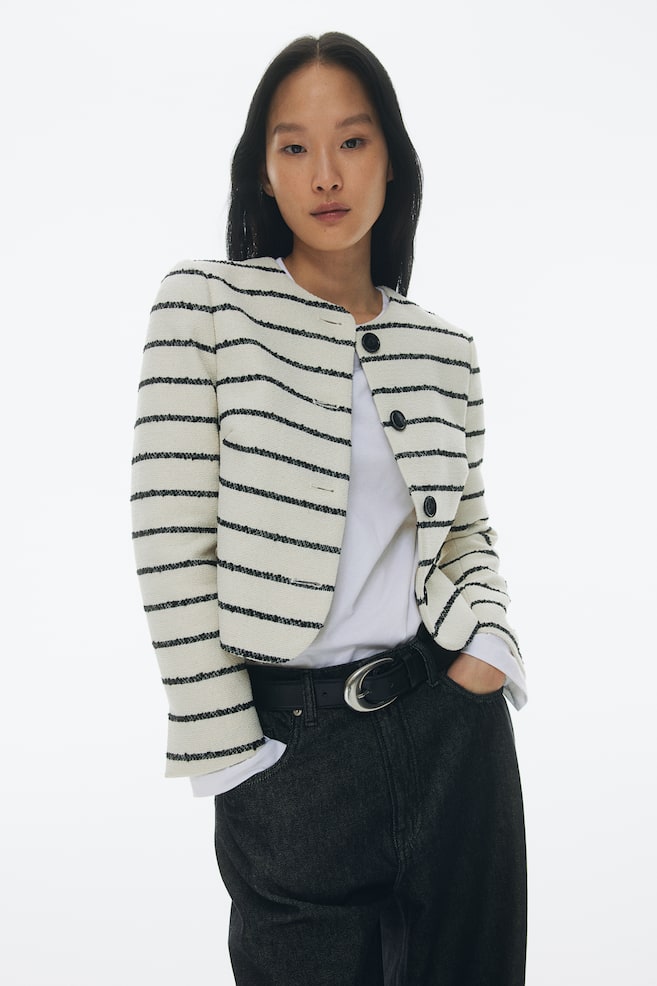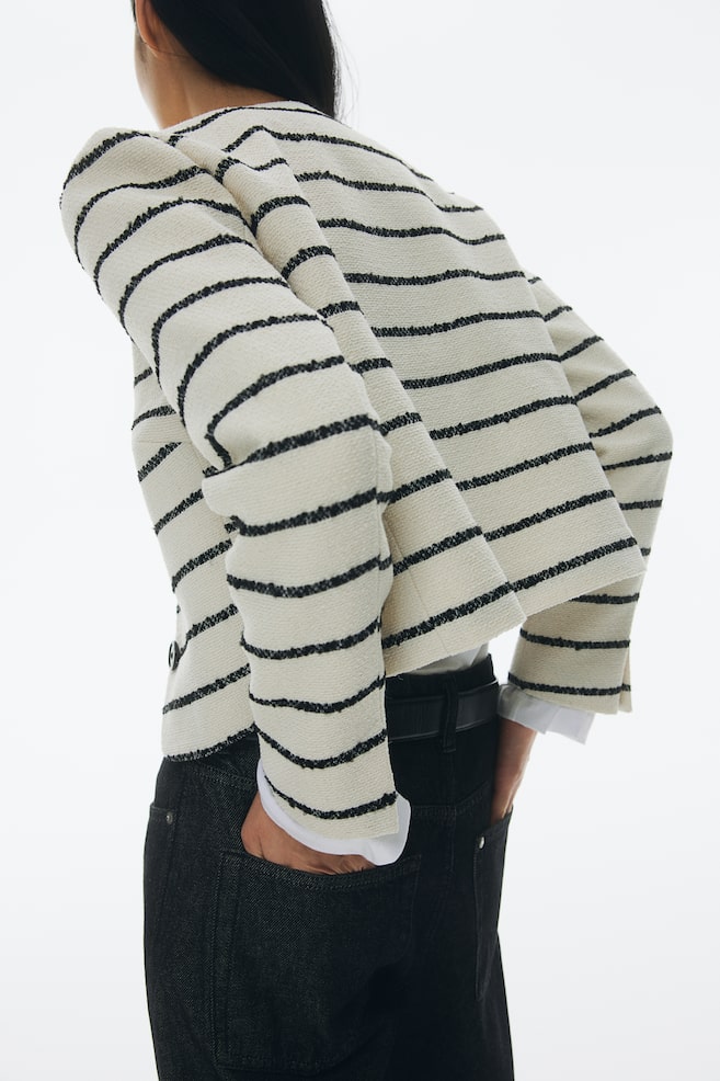 Короткий тканевый жакет с круглым вырезом, пуговицами спереди, вытачками на груди и декоративными разрезами на рукавах. На подкладке.