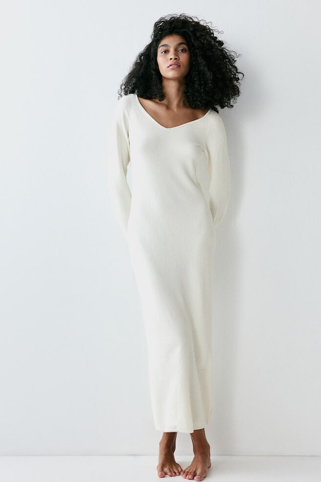 Длинное платье из тонкой вязки из удивительно мягкой пряжи шенилл с облегающим кроем, V-образным вырезом с открытыми плечами и длинными рукавами.