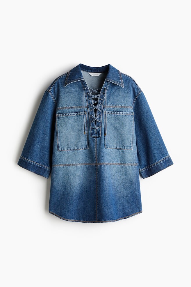 Блузка свободного покроя из хлопкового денима с контрастными швами, открытым воротником и шнуровкой спереди. Большие нагрудные карманы, спущенная линия плеча и рукава длиной до локтя. Слегка закругленный подол.