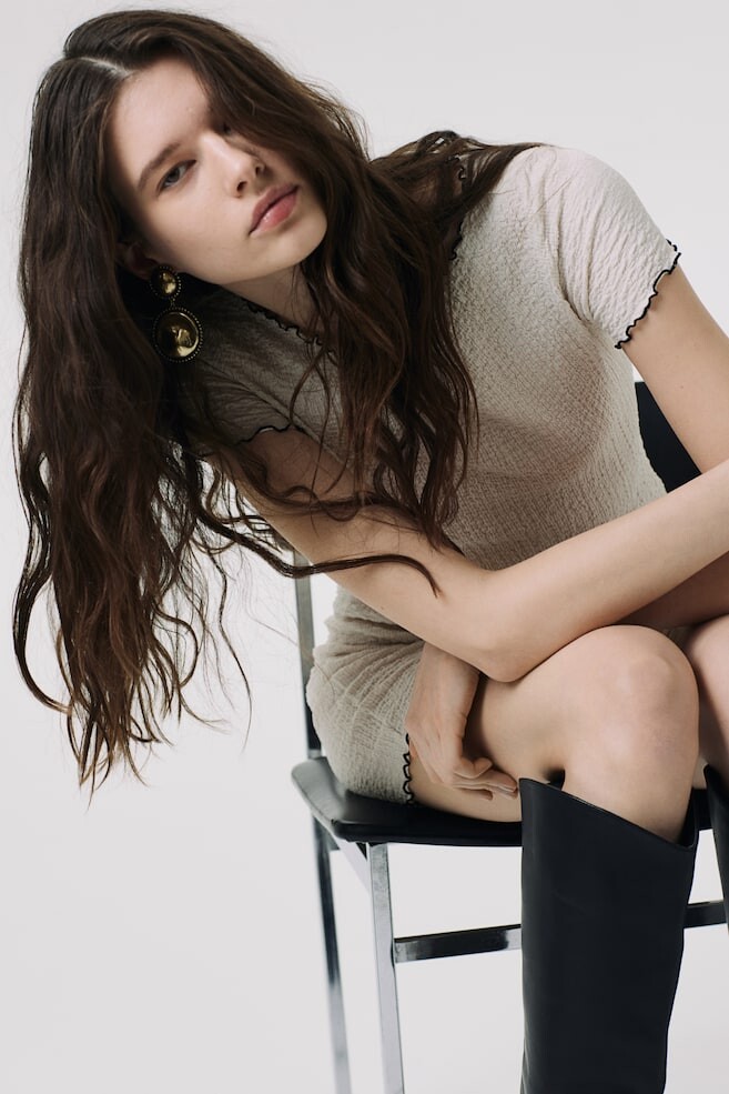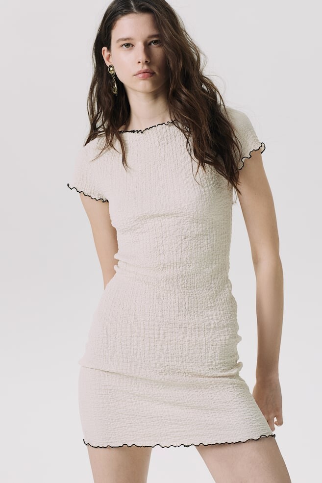 Короткое облегающее платье из жатого трикотажа с оверлочными краями. Вырез лодочкой и короткие рукава.