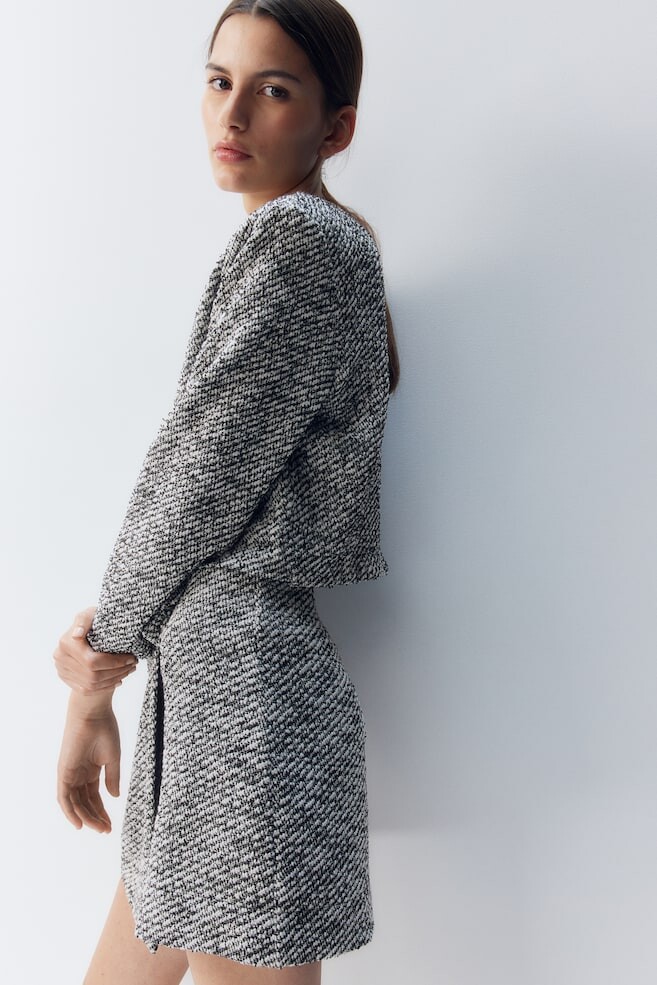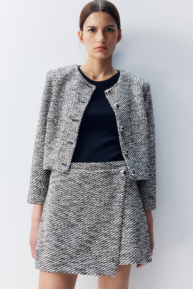 Короткий кардиган из букле. С круглым вырезом, подплечниками и металлическими пуговицами.