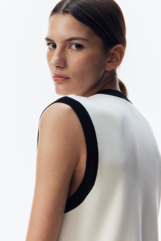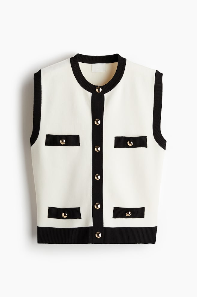 Короткий, облегающий свитер плотной вязки с контрастными краями. С круглым вырезом, металлическими пуговицами и ложной грудью, а также передними карманами на пуговицах.